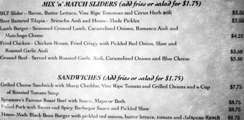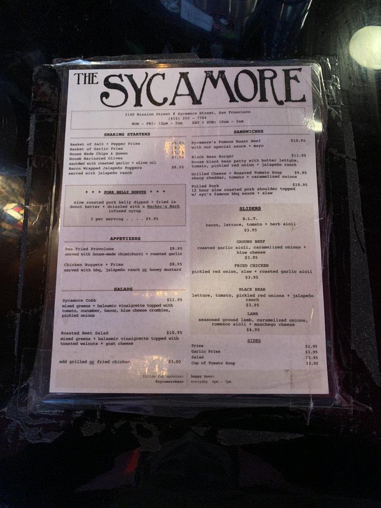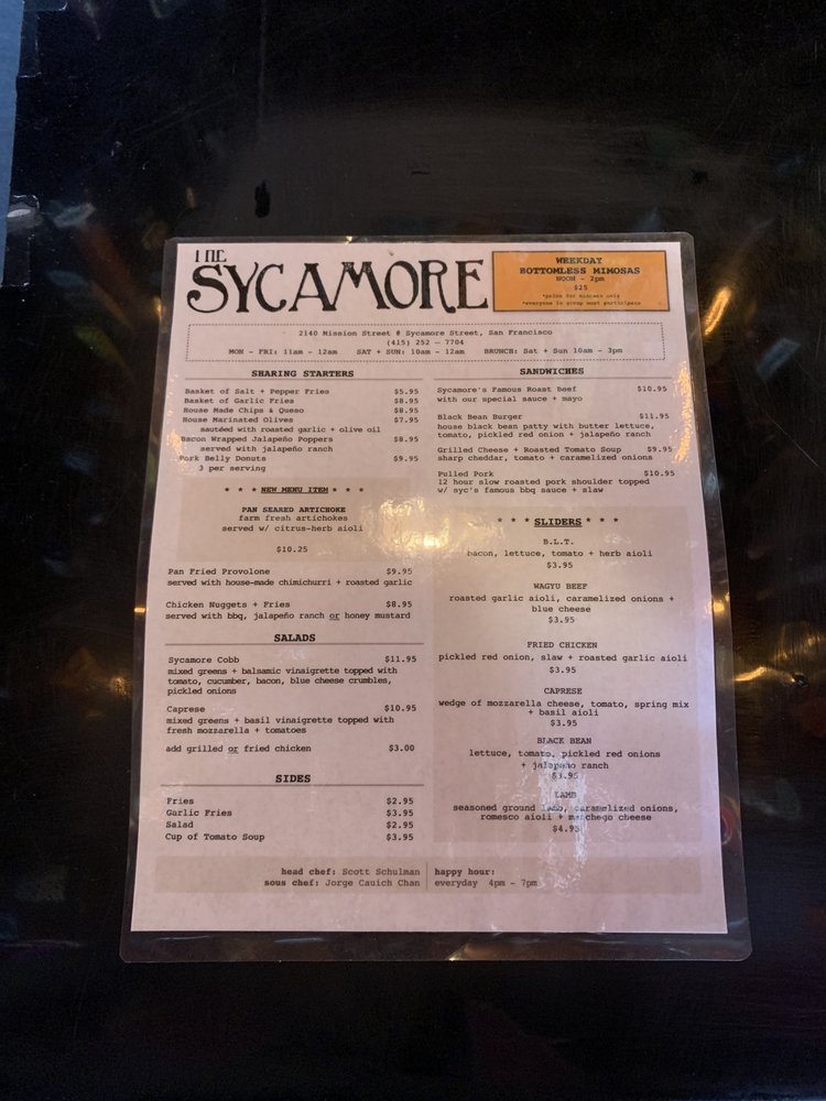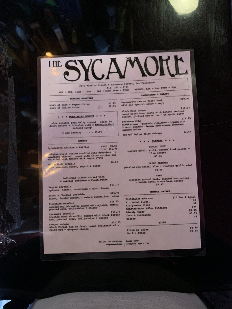 Located in San Francisco's Mission District, The Sycamore offers a cozy and hipster vibe with a range of unique menu options. From fries with various toppings to appetizers like bacon-wrapped jalapeno poppers and fried Brussels sprouts, the menu at The Sycamore is diverse and appealing. Sandwich options include a black bean burger and a fried chicken sandwich, while customer reviews praise the chicken and waffles and beef sliders. The atmosphere is described as homey and welcoming, with communal picnic tables in the back patio, making it a great spot for group dining. Whether you're looking for a fun brunch spot or a laid-back bar to enjoy drinks and good food, The Sycamore is worth a visit.
